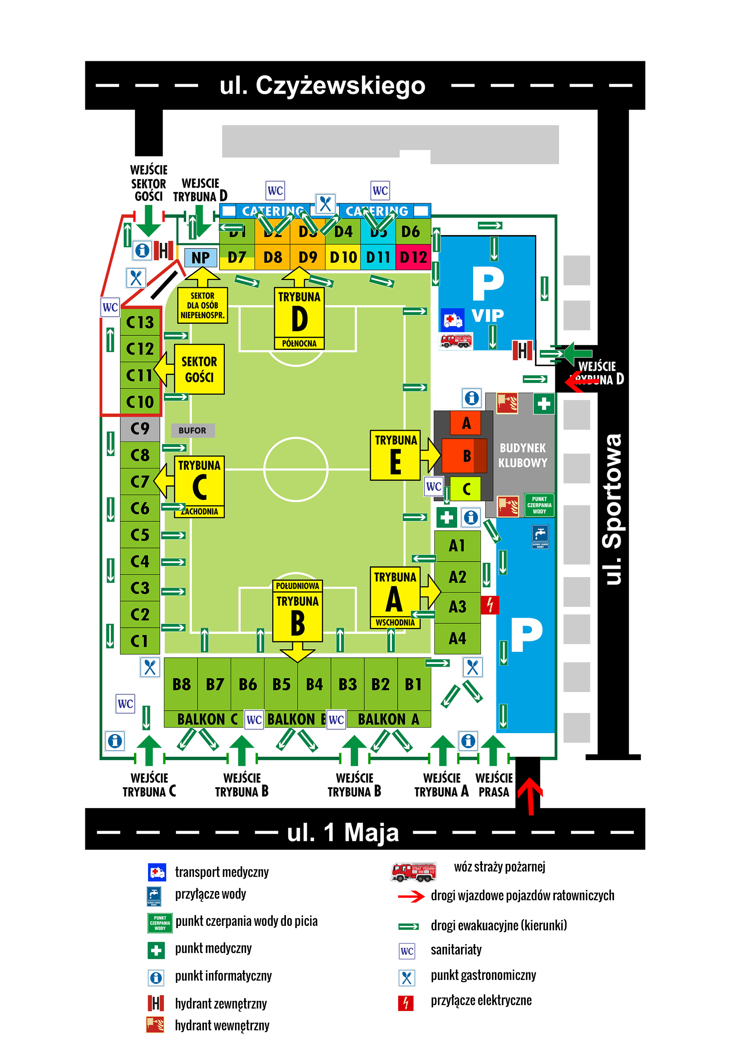 - z biletami zakupionymi na sektory D1-D12 wchodzimy bramofurtą znajdującą się od strony ulicy Sportowej.