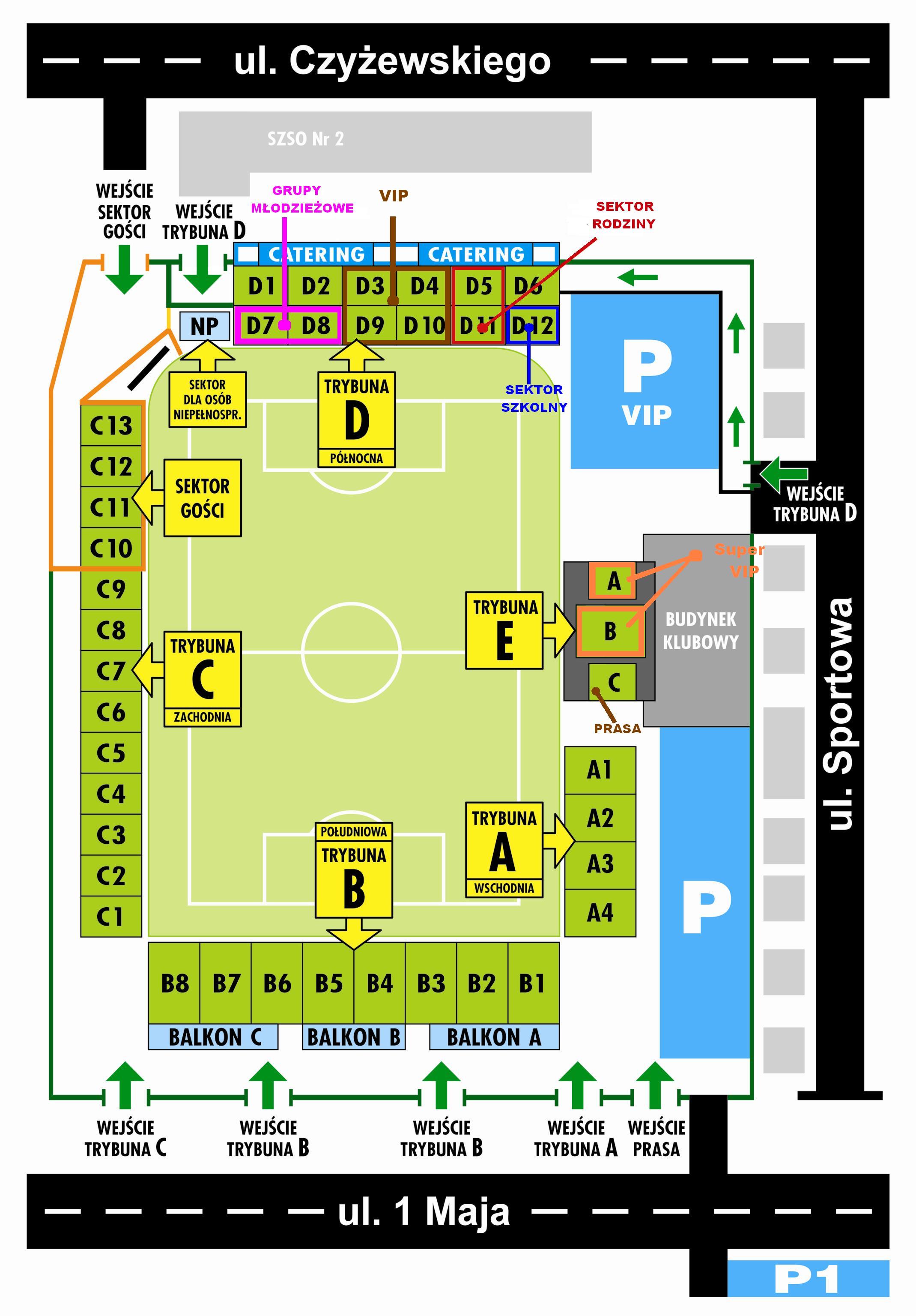 - wejście na trybunę wschodnią (przez kołowrót i w osłonie twarzy i nosa) znajdować się będzie na lewo od kasy po sprawdzeniu listy. Dla dziennikarzy oraz fotoreporterów udostępnione zostaną miejsca na sektorach A2, A3 i A4 na trybunie A (wschodniej)