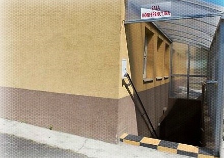 Wejście do sali konferencyjnej znajduje się za budynkiem klubowym